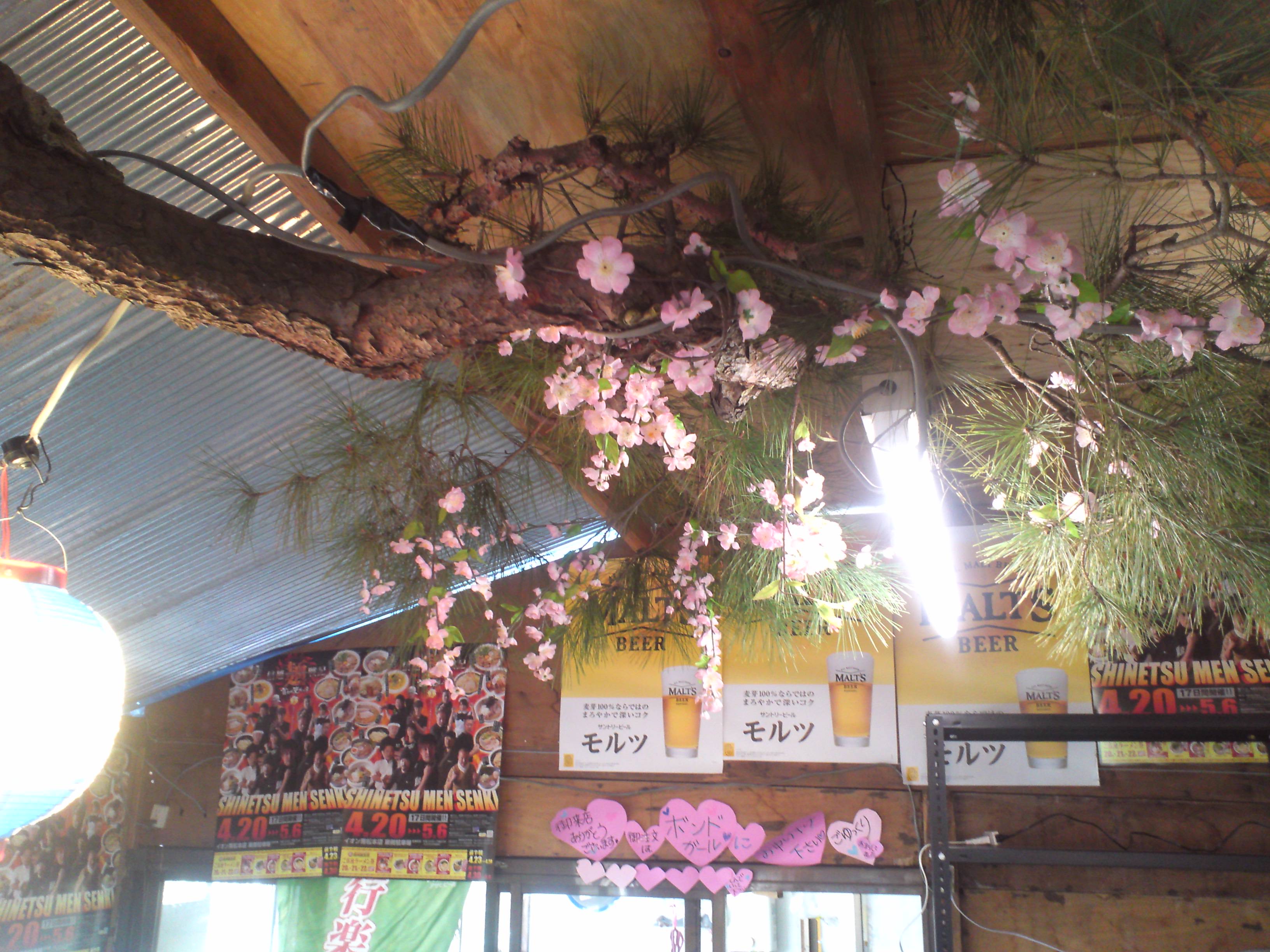 名物、屋根を突き抜けている松の木も桜満開?!で皆様のお越しをお待ちしてます!!(^-^)/